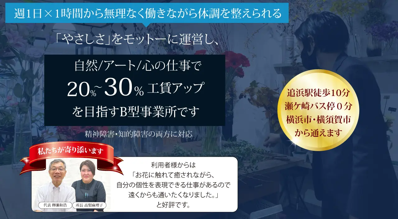 追浜駅・六浦駅・汐入駅・能見台駅から通える就労継続支援B型事業所として、各駅からの検索結果1位となっています。横浜市や横須賀市で高い工賃の就労継続支援B型事業所をお探しの方はぜひお越しください。またB型事業所やA型事業所の違いなど基本的な情報がない方も、無料にてご相談を受けております。お気軽にお電話ください。