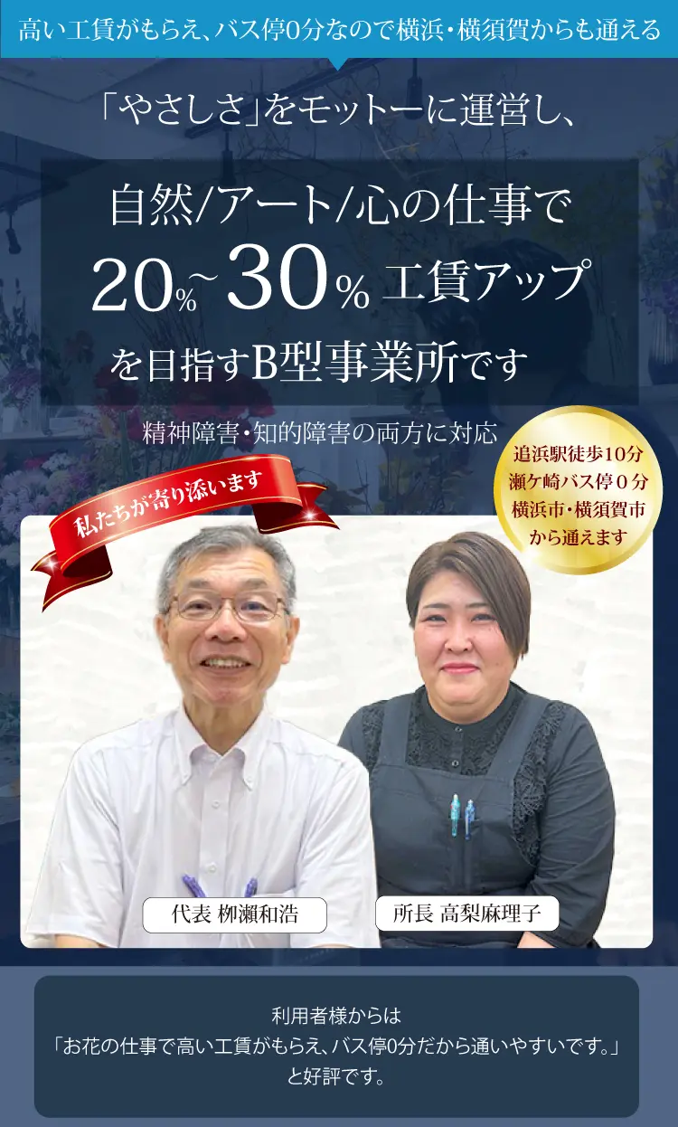 追浜駅・六浦駅・汐入駅・能見台駅から通える就労継続支援B型事業所として、各駅からの検索結果1位となっています。横浜市や横須賀市で高い工賃の就労継続支援B型事業所をお探しの方はぜひお越しください。またB型事業所やA型事業所の違いなど基本的な情報がない方も、無料にてご相談を受けております。お気軽にお電話ください。